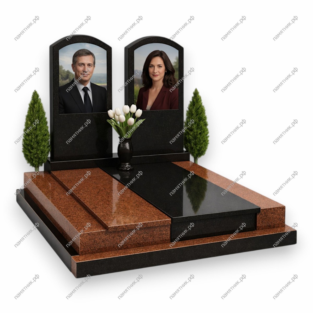 Элегантный и лаконичный комплекс, сочетающий две классические черные стелы с арочным верхом. Особенностью мемориала является уникальное каскадное надгробие с чередованием черных и красно-коричневых плит.