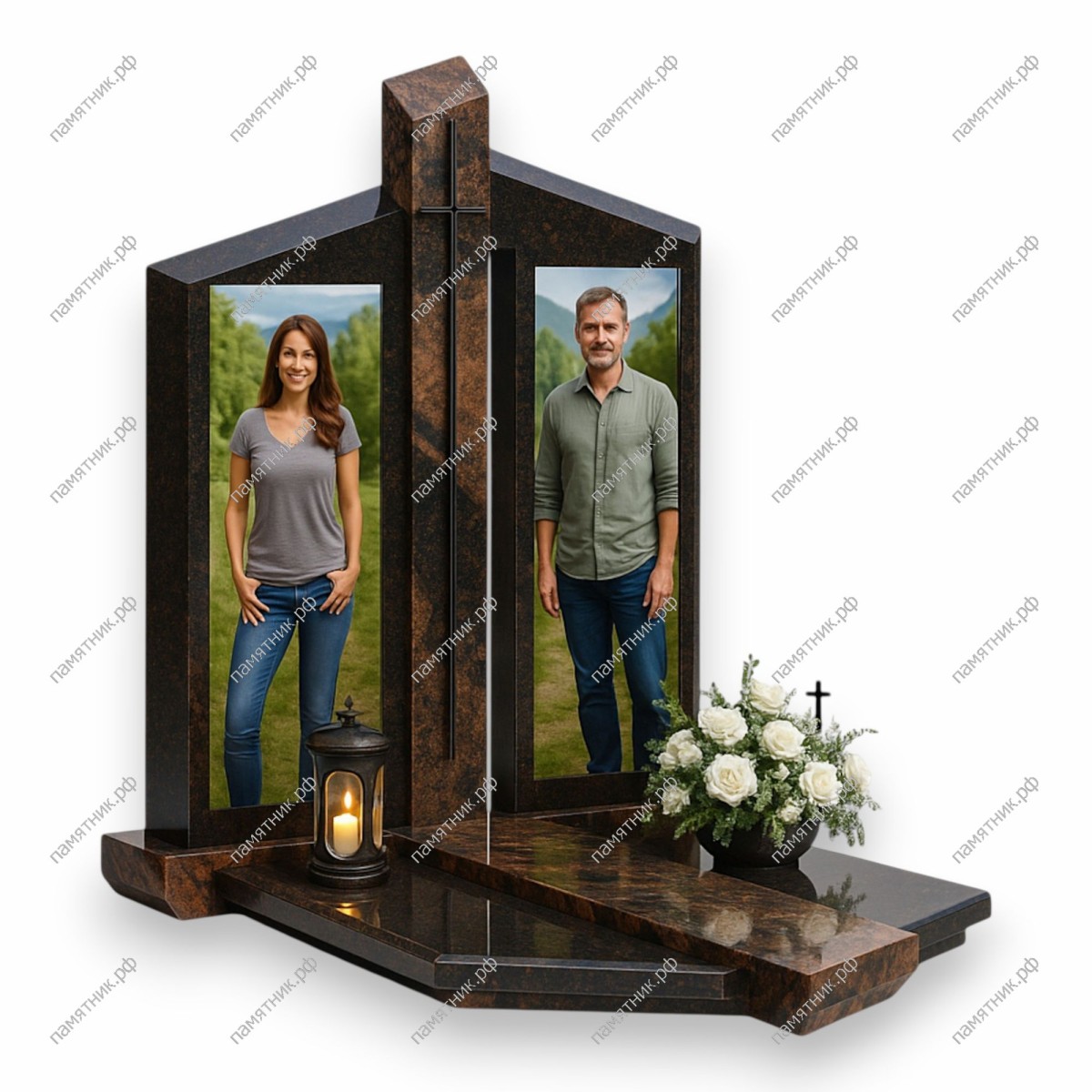 Монументальный комплекс, впечатляющий своей геометрией и пространством для ростовых портретов. Центральный возвышающийся пилон со строгим крестом делит композицию на две симметричные ниши.