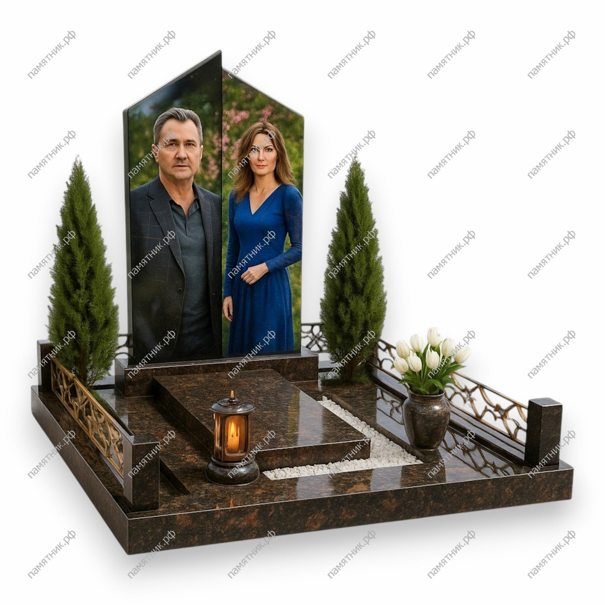 Элегантный мемориал из благородного крапчатого коричневого гранита. Сдвоенная стела имеет выразительную асимметричную форму с заостренным верхом, символизирующую единение и стремление к свету.