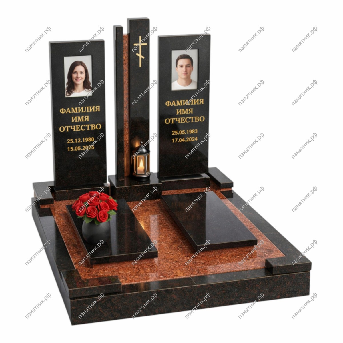 Ультрасовременный архитектурный комплекс в стиле минимализма. Строгие вертикальные линии доминируют в композиции: две независимые стелы и высокая центральная колонна с крестом установлены на массивном подиуме из красного гранита.