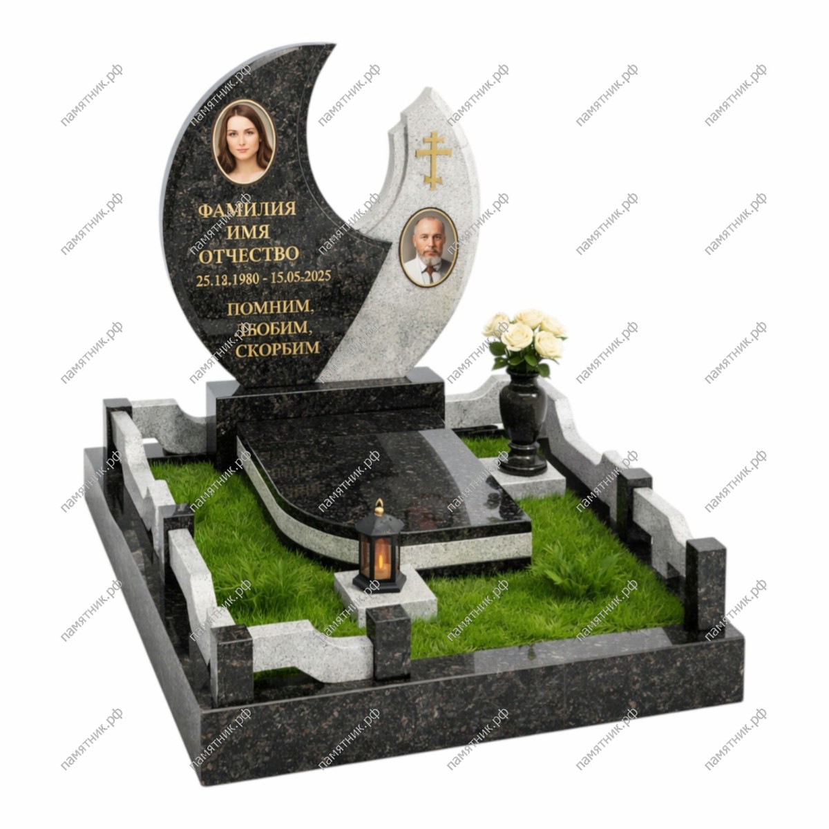 Эффектный и нестандартный мемориал, построенный на контрасте форм и цвета. Левая массивная стела из черного гранита плавно перетекает в светлую правую часть, образуя фигуру, напоминающую полумесяц или символ инь-ян. Композиция завершается стилизованной гранитной оградой, выполненной в тех же контрастных тонах.