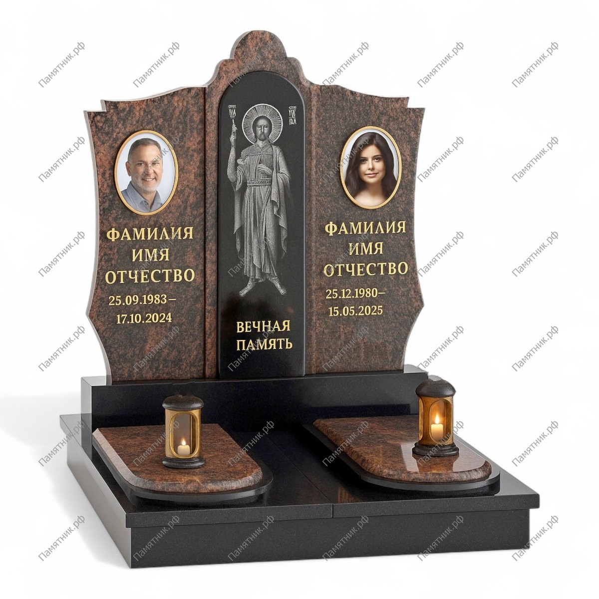 Торжественный и высокодуховный комплекс классической формы. Центральным элементом выступает строгая черная стела с ростовой гравировкой лика Иисуса Христа. По бокам от нее симметрично расположены фигурные стелы из благородного коричневого гранита для портретов усопших.