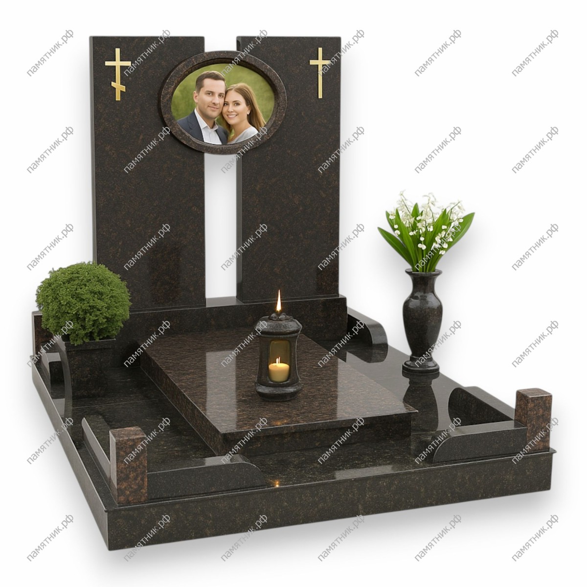 Монументальный мемориал из темного гранита с благородной текстурой. Композиция состоит из двух вертикальных стел, объединенных в верхней части общим овальным портретом в массивной рамке.