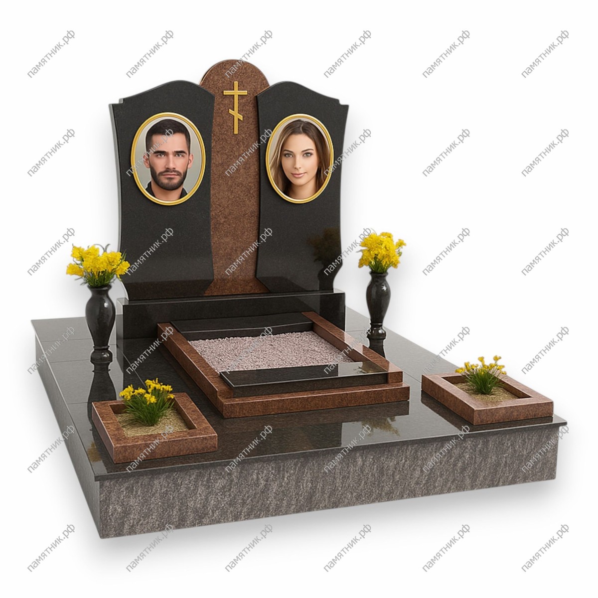 - Центральный гранитный элемент коричневого цвета с золотым восьмиконечным крестом.
