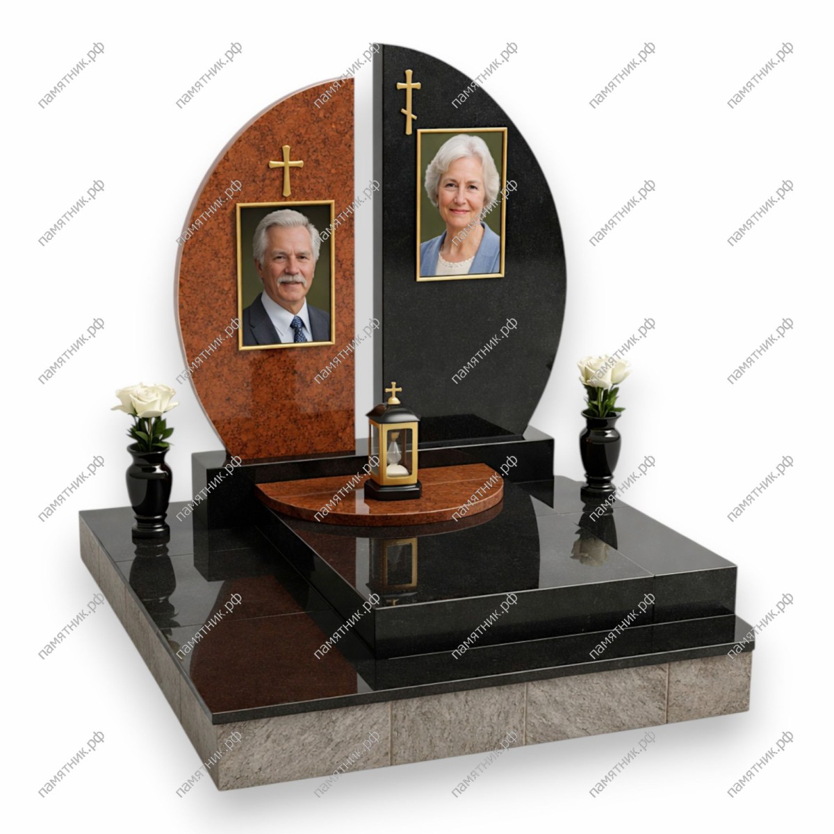 - Левая часть стелы — из насыщенного красного гранита, правая — из классического черного.