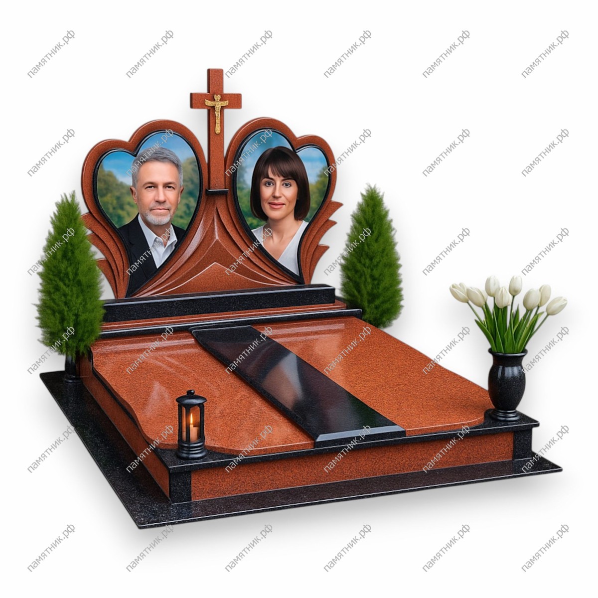 - Объемное надгробие из красного гранита с широкой черной полосой по центру.