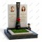 Светлый, современный и лаконичный памятник. Основные стелы выполнены из светло-серого гранита, что придает захоронению особую легкость и чистоту. Их разделяет сужающаяся книзу центральная колонна из черного камня, увенчанная золотым крестом.