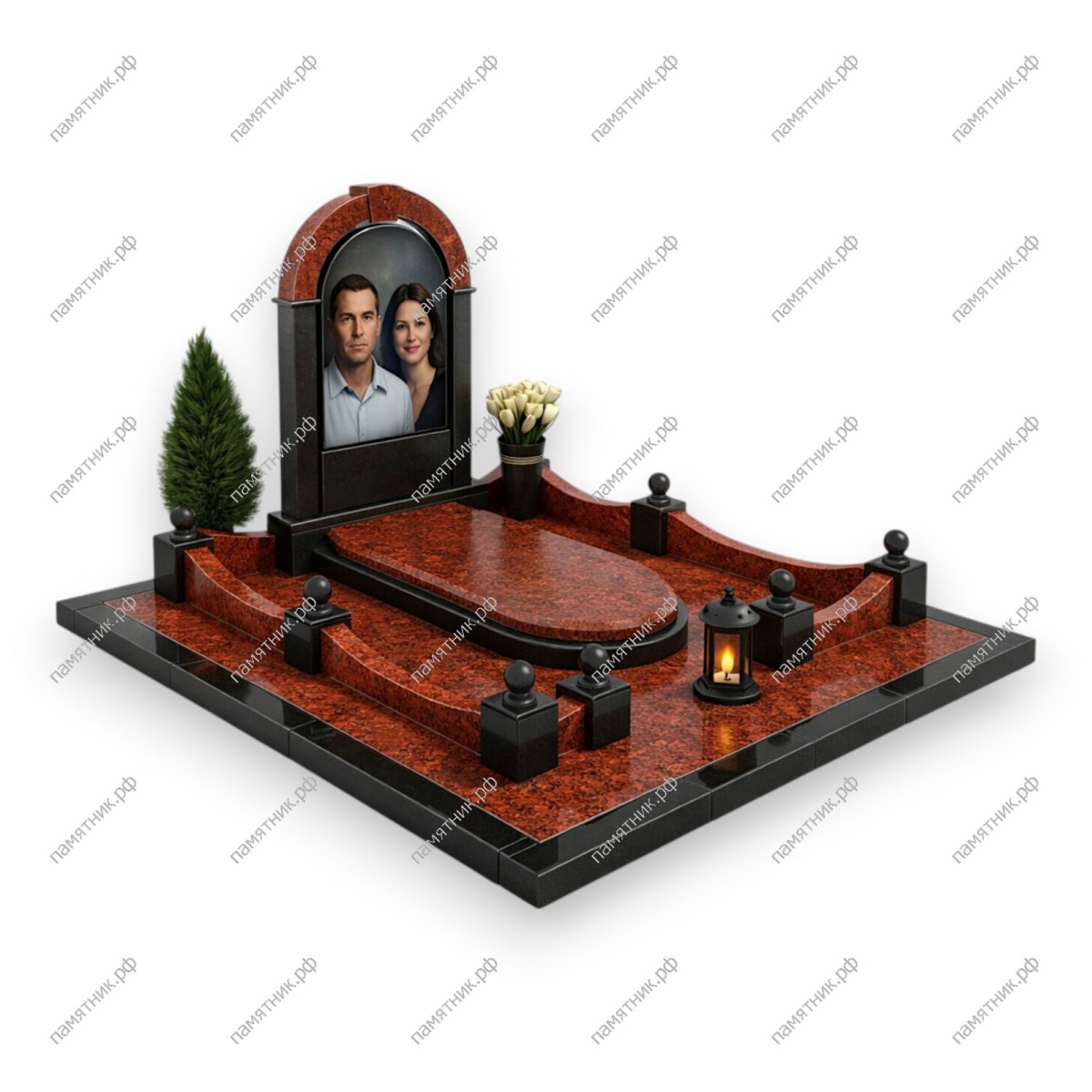 - Центральная стела в форме арки с глубокой нишей под широкоформатный портрет.