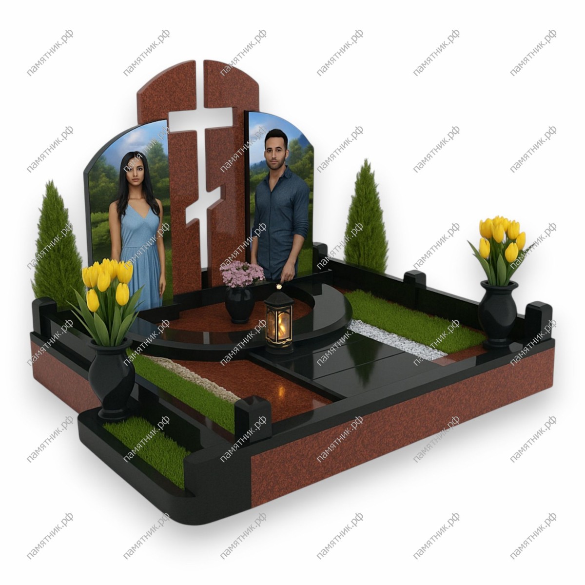 - Оригинальное надгробие с полукруглой вставкой и комбинированным покрытием (полированный камень, газон, крошка).