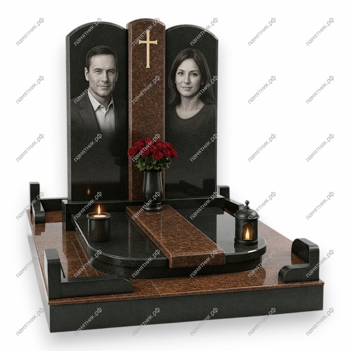 Элегантный памятник с плавными дугообразными формами. Сочетание черного и коричневого гранита придает комплексу глубину и торжественность.