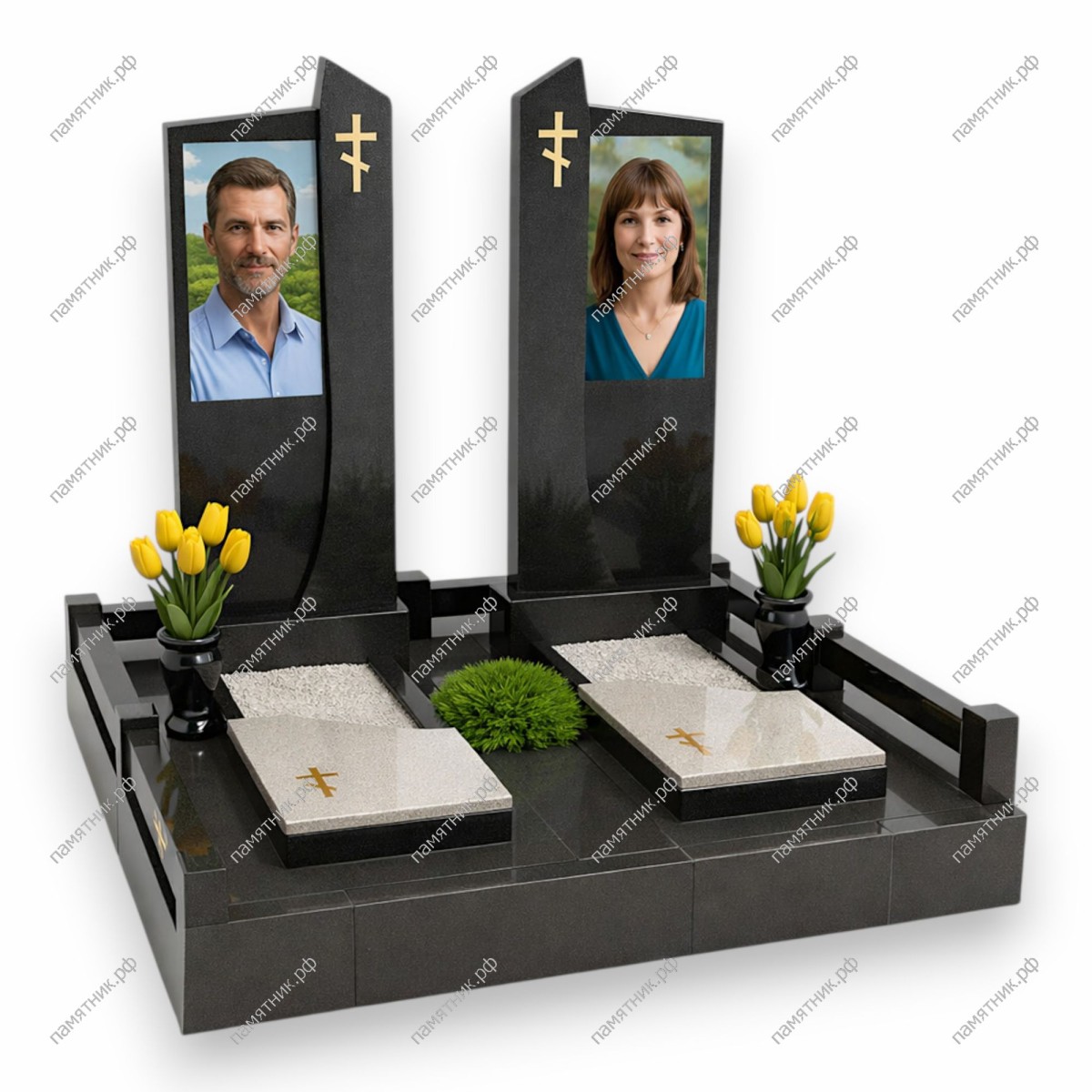 - Две светлые надгробные плиты, контрастирующие с основным цветом комплекса.