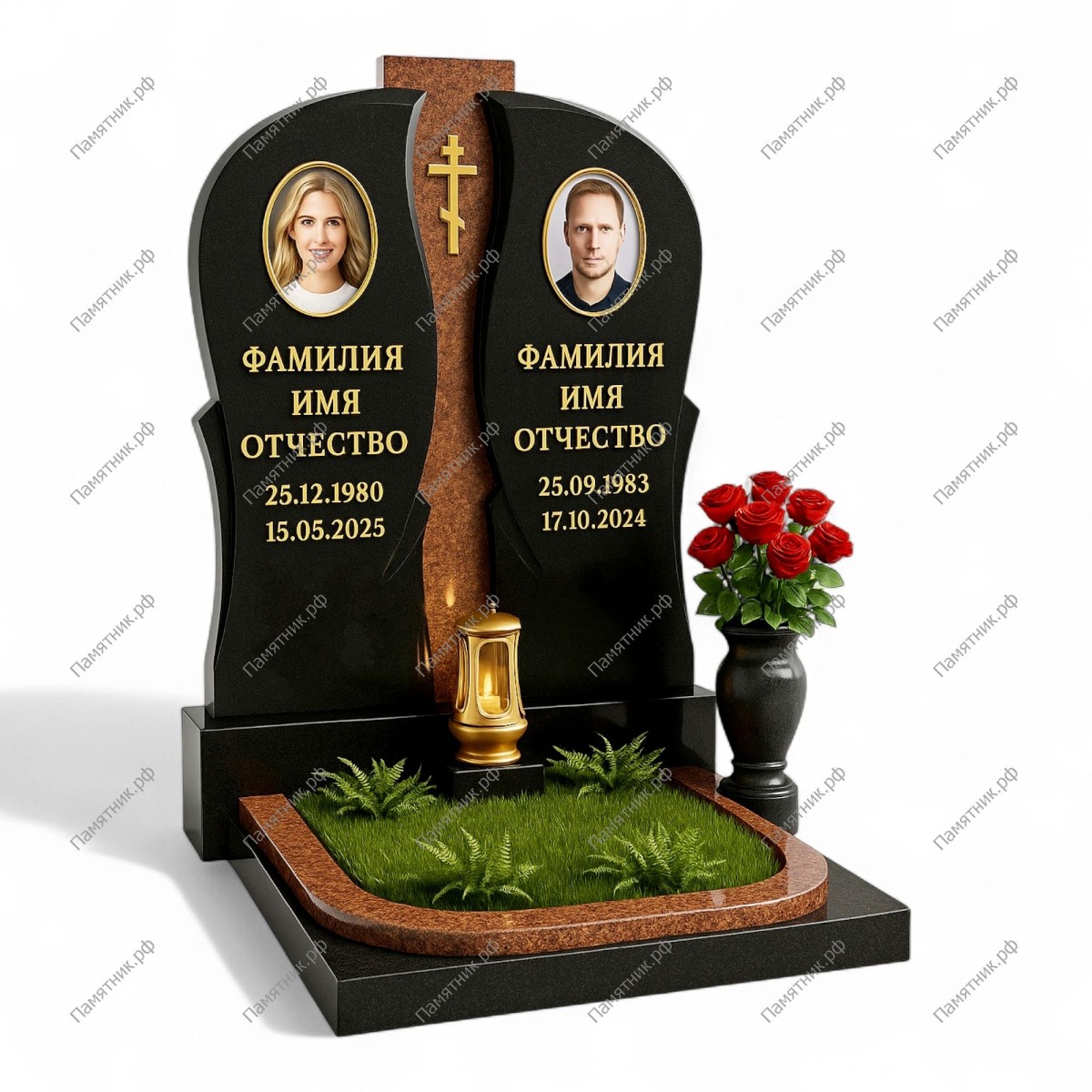 Мемориал с мягкими, обтекаемыми формами. Черные стелы имеют изогнутые внутренние грани, словно обнимающие центральную колонну из фактурного коричневого камня. Особенностью является нестандартный цветник со скругленными внешними углами.