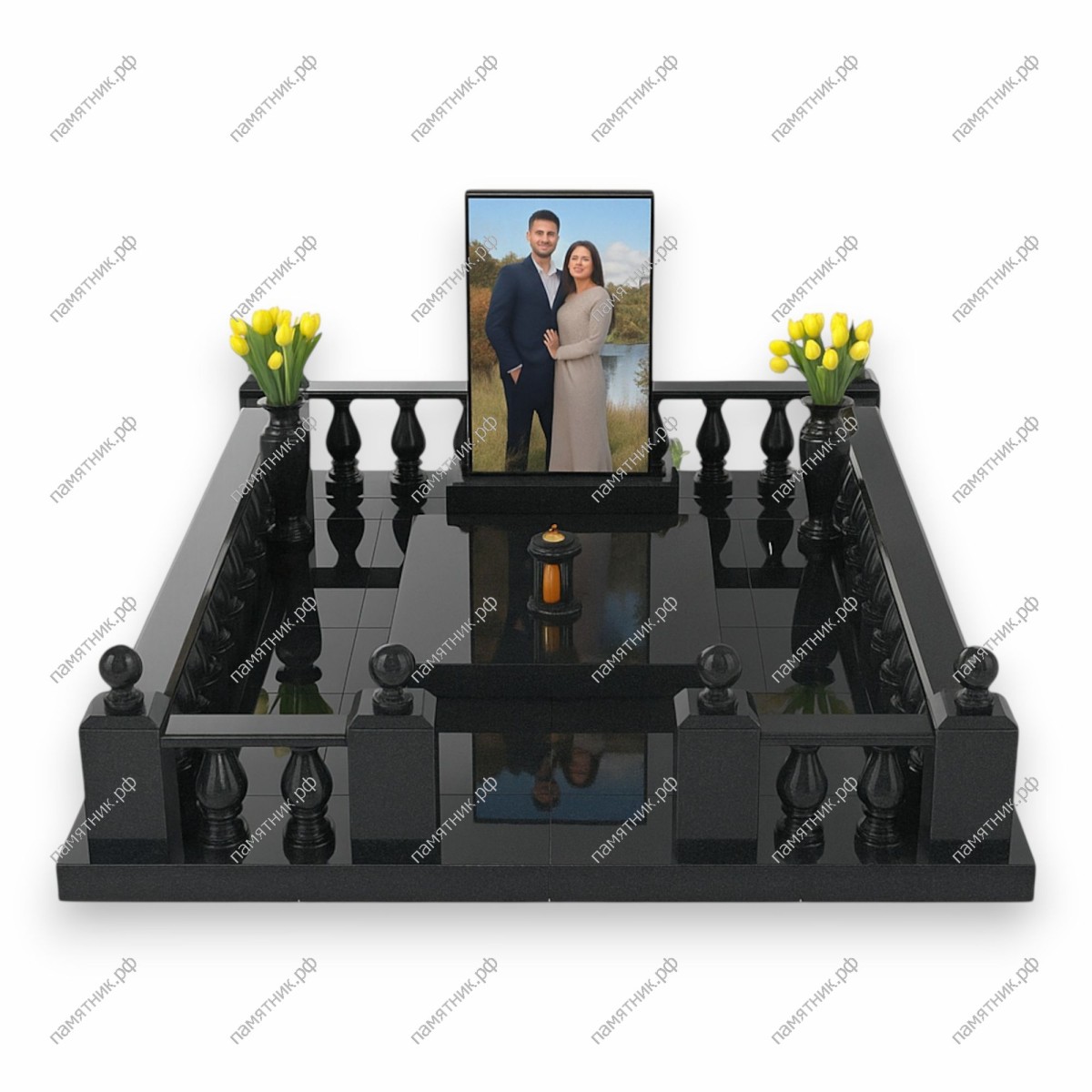 - Полностью вымощенная черным гранитом площадка с зеркальным эффектом.
