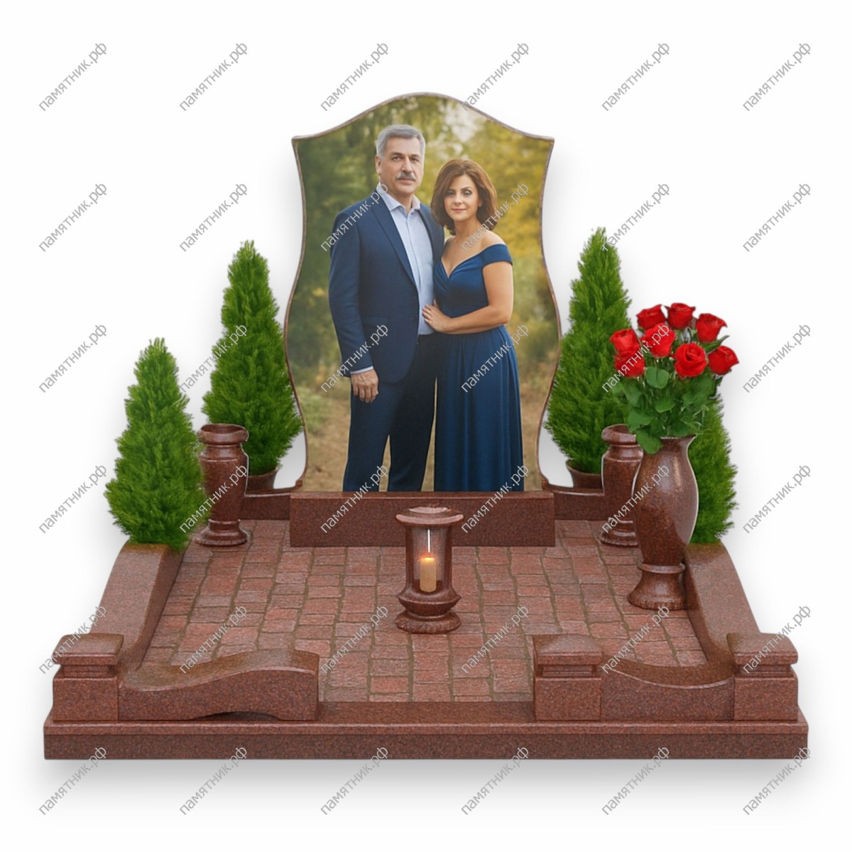 Роскошный мемориальный ансамбль из красного гранита. Композиция имитирует уютный дворик, выложенный брусчаткой, что создает атмосферу домашнего тепла и покоя.