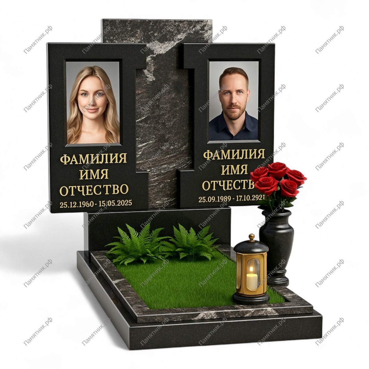Ультрасовременный мемориал в стиле конструктивизма. Две строгие черные стелы с прямоугольными нишами под портреты визуально накладываются на широкую центральную панель из фактурного темно-серого гранита с красивым природным рисунком.