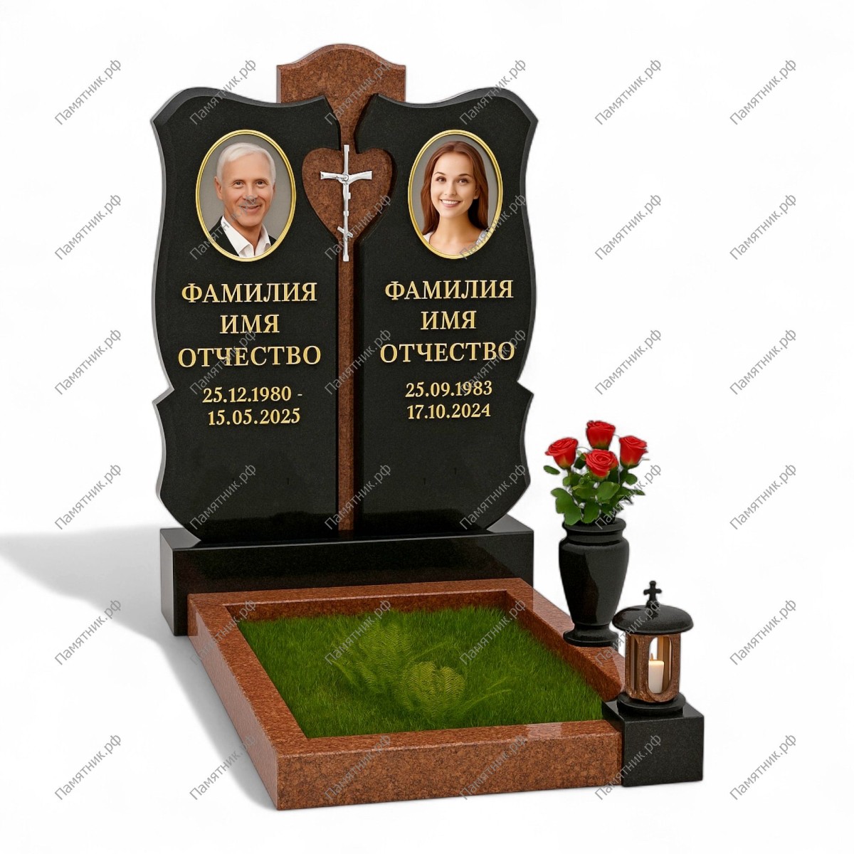 Трогательный семейный мемориал с глубоким смысловым акцентом. Между двумя классическими черными стелами расположена колонна из коричневого гранита со сквозным вырезом в форме сердца, внутри которого установлено изящное распятие.