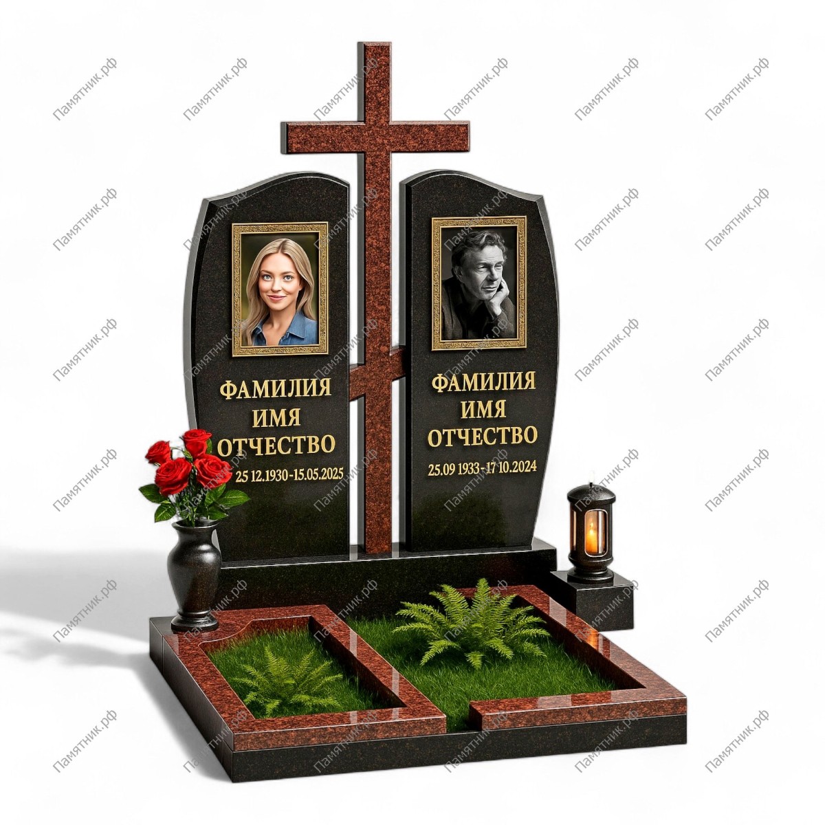 Величественный памятник, в котором главным духовным и визуальным центром выступает высокий православный крест из цветного коричневого гранита. Он возвышается над двумя симметричными черными стелами со скругленными краями, символизируя веру и вечную защиту.
