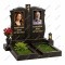 Классический семейный памятник, выражающий глубокое почтение и духовную связь. Две симметричные черные стелы с резными краями разделены строгим черным столбом, увенчанным золотым православным крестом. Строгий, традиционный и очень аккуратный дизайн.