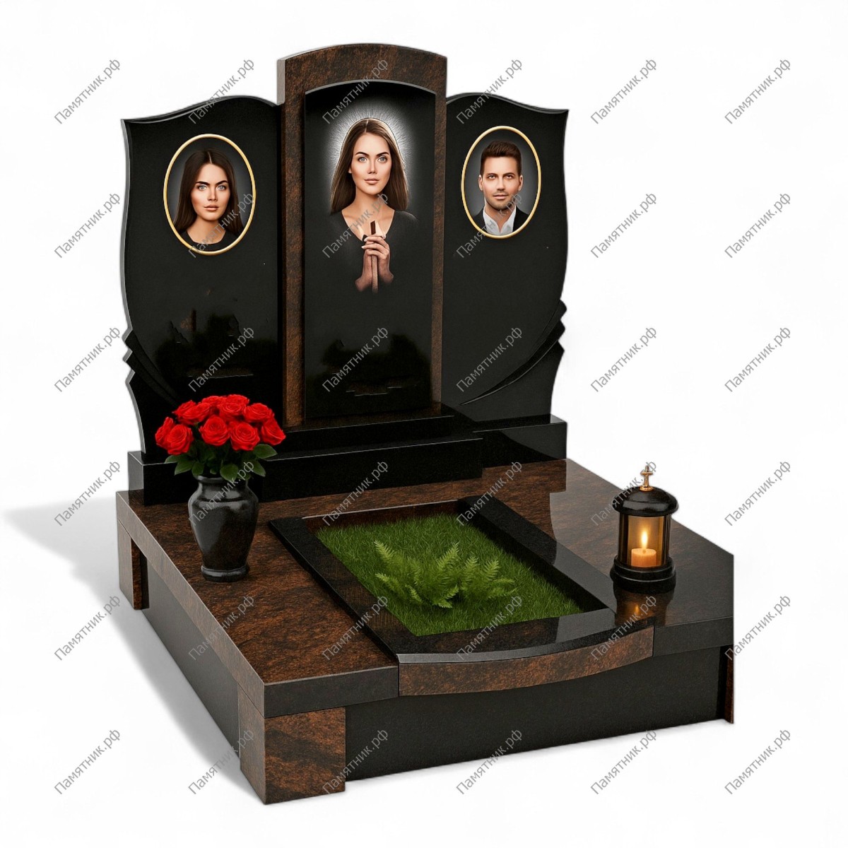 Солидный и масштабный мемориал, состоящий из трех элементов. Центральная высокая стела из черного гранита обрамлена выразительной рамкой из коричневого камня. Боковые черные панели с плавными изгибами предназначены для портретов. Композиция выглядит очень статусно и позволяет разместить крупное изображение или барельеф по центру.