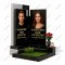Ультрасовременный мемориал в стиле минимализма и строгой геометрии. Две черные прямоугольные стелы разной высоты установлены на фоне широкой светло-серой панели. Этот многоуровневый дизайн создает эффект глубины и подчеркивает контраст материалов.