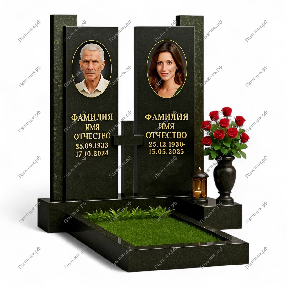 Строгий, монументальный и очень благородный памятник. Две вертикальные черные стелы с портретами установлены на фоне панелей из глубокого темно-зеленого гранита. Разделяет их строгий черный крест. Дизайн транслирует надежность, покой и вечную память.