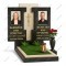 Современный комплекс со сложной врезкой геометрических форм. Черные стелы выполнены в виде рамок или букв «Г», которые визуально обхватывают центральную светло-бежевую стелу с золотым крестом. Очень стильное и нестандартное решение.