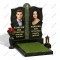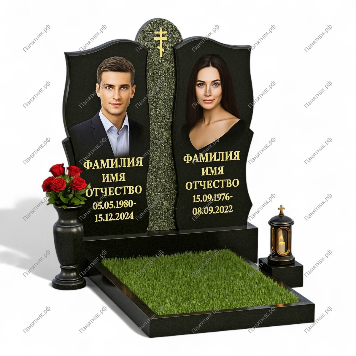 Традиционный семейный мемориал с изящной резьбой по контуру. Черные стелы украшены сложным волнообразным профилем по верхнему и боковым краям. Центральная колонна из фактурного зеленовато-серого камня увенчана полукруглым сводом с крестом.