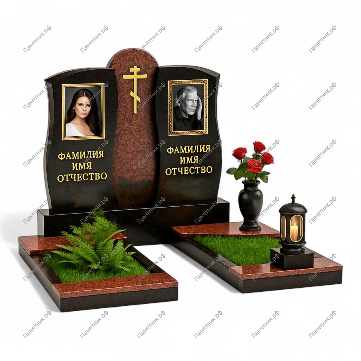 Традиционный комплекс, сочетающий в себе строгость черного камня и теплоту красного гранита. Две симметричные черные стелы объединены центральной арочной вставкой из цветного гранита, на которой расположен золотой крест. Дизайн воплощает светлую память и надежду.