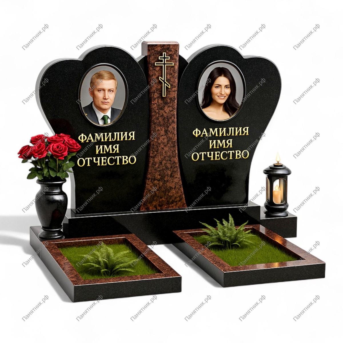 Трогательный и символичный комплекс, форма стел которого при соединении образует силуэт сердца. Это идеальный выбор для захоронения супругов, подчеркивающий вечную любовь. Смысловым центром композиции служит разделительная колонна из цветного гранита с крестом.