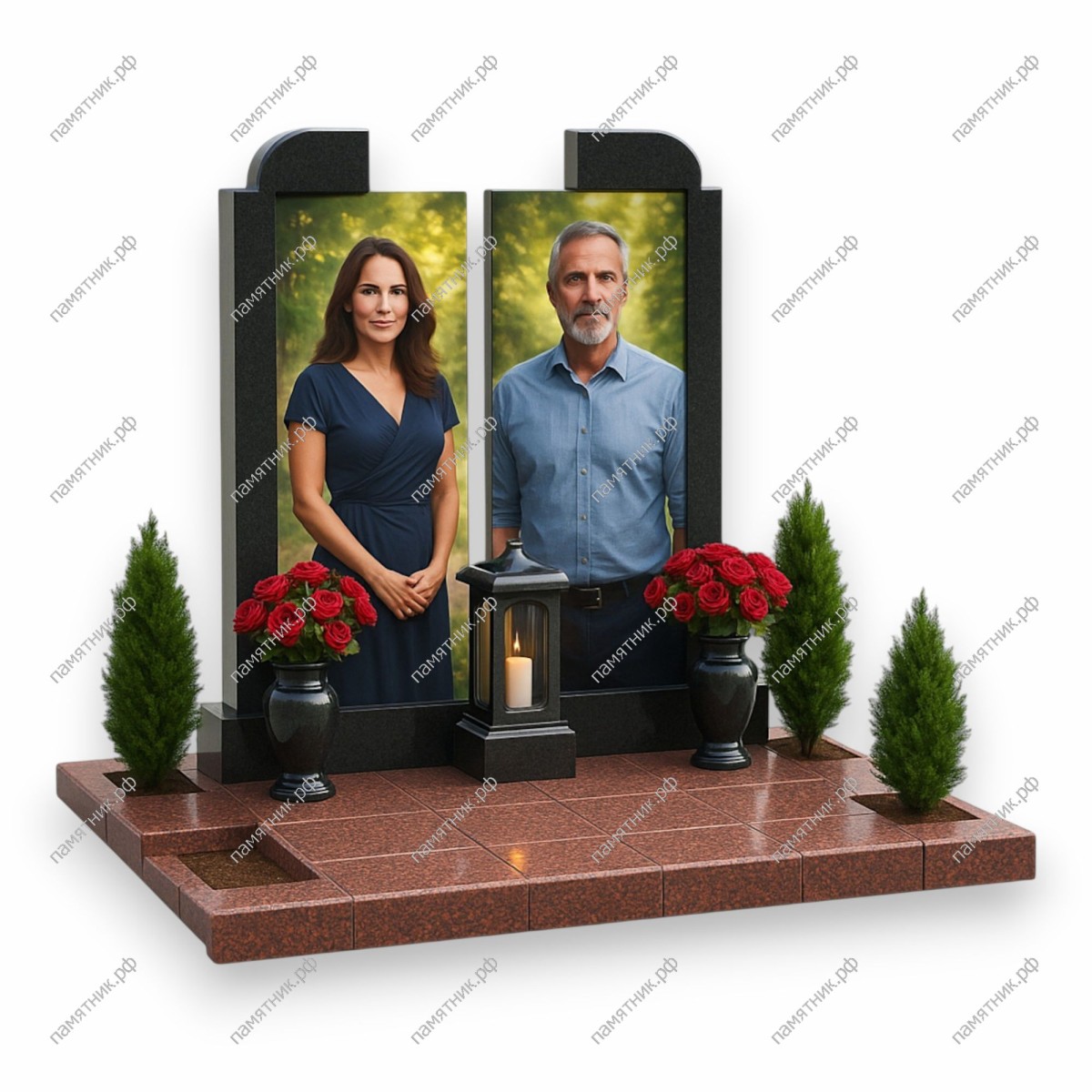 Современный комплекс с двумя высокими независимыми стелами. Главный акцент сделан на крупные ростовые портреты на фоне природы, что делает памятник светлым и одухотворенным. Уникальное оформление подиума гранитной плиткой придает захоронению аккуратный, ухоженный и европейский вид.