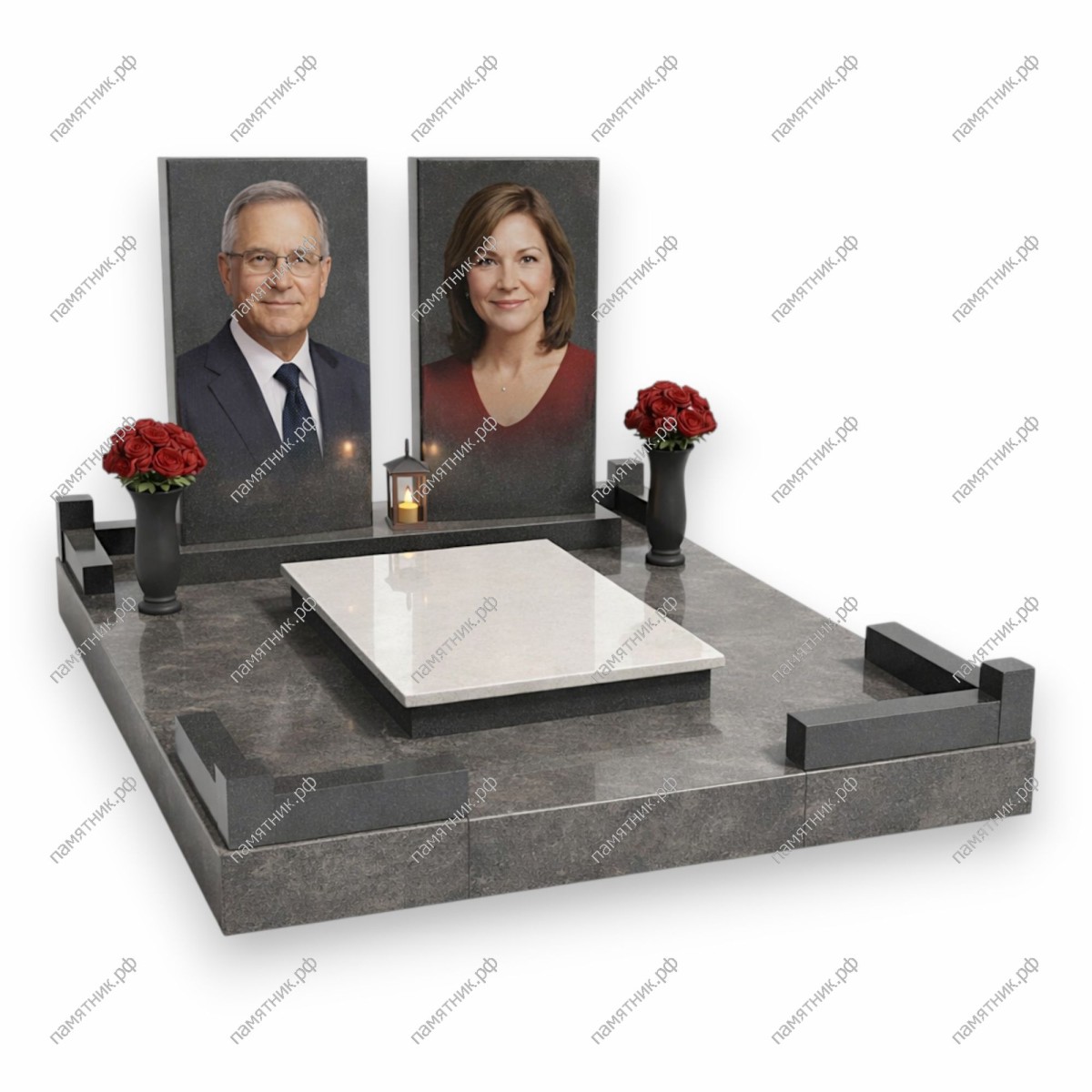 Строгий и элегантный памятник, выполненный из благородного серого гранита с выраженной текстурой (под мрамор). Две независимые прямоугольные стелы классической формы визуально объединяются светлой надгробной плитой в центре, создающей красивый цветовой контраст.