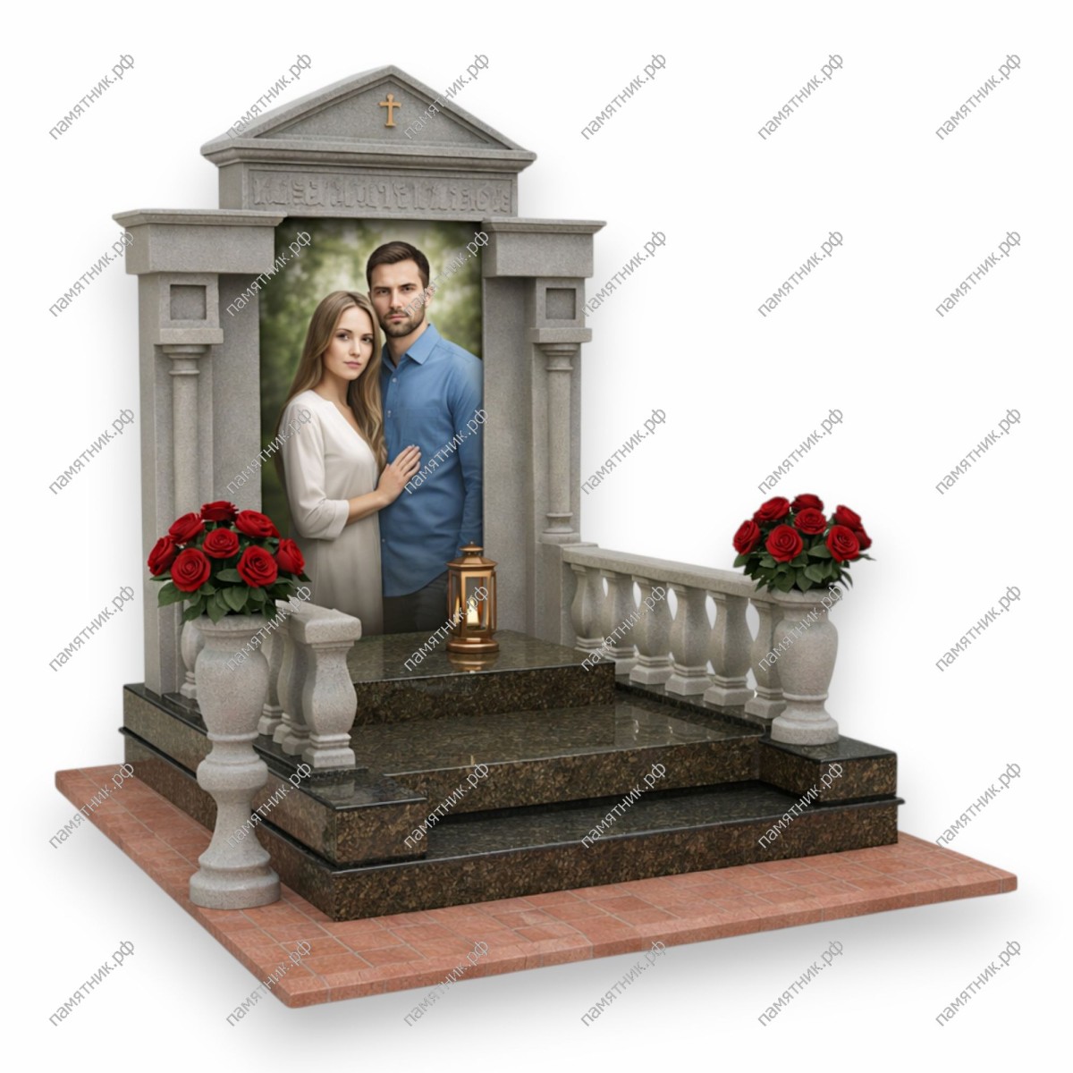 Величественный мемориальный ансамбль, стилизованный под античный портик или храмовые врата. Центральную часть занимает масштабный семейный портрет. Роскошное многоуровневое основание и гранитная балюстрада подчеркивают эксклюзивность и премиальность проекта.