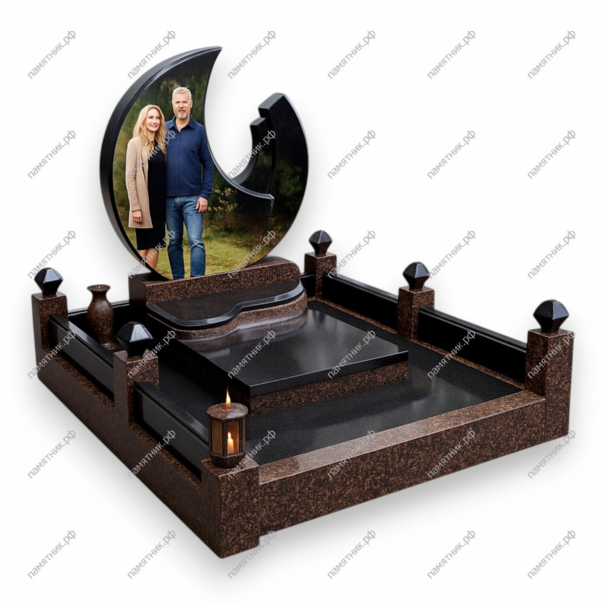 Уникальный авторский памятник нестандартной формы. Силуэт стелы напоминает полумесяц или пламя, служа эффектным обрамлением для интегрированного цветного портрета. Роскошный многоуровневый подиум из гранита двух цветов придает захоронению особую монументальность.