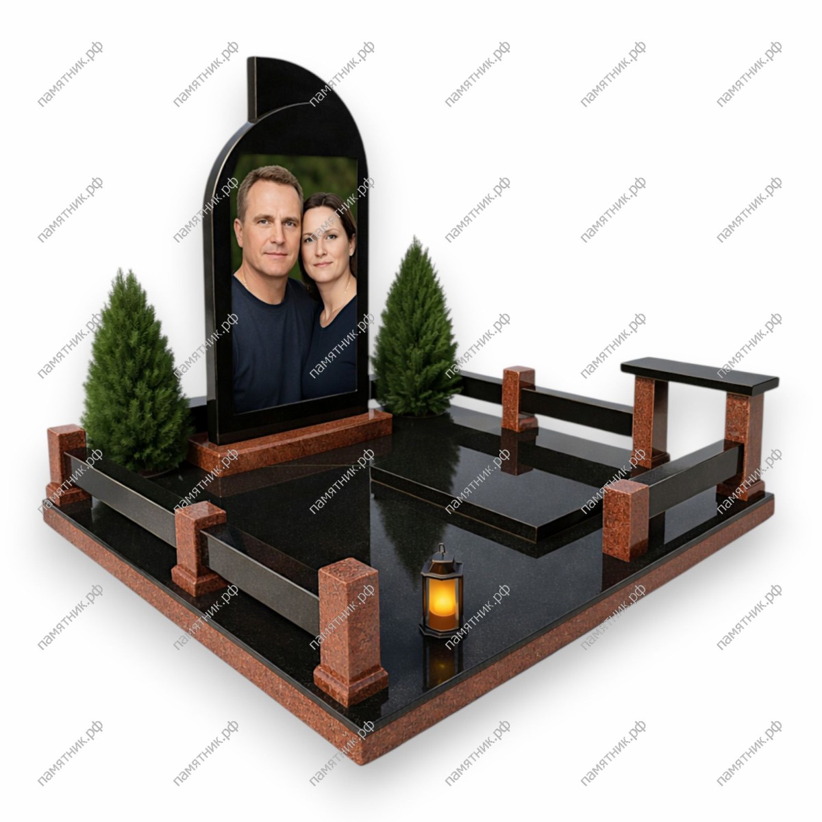 Современный и элегантный комплекс с высокой стелой арочной формы, в которую интегрирован масштабный цветной портрет. Основание выполнено из строгого черного гранита и обрамлено стильной оградой, где черные перемычки гармонично сочетаются с массивными столбиками из красно-коричневого гранита.