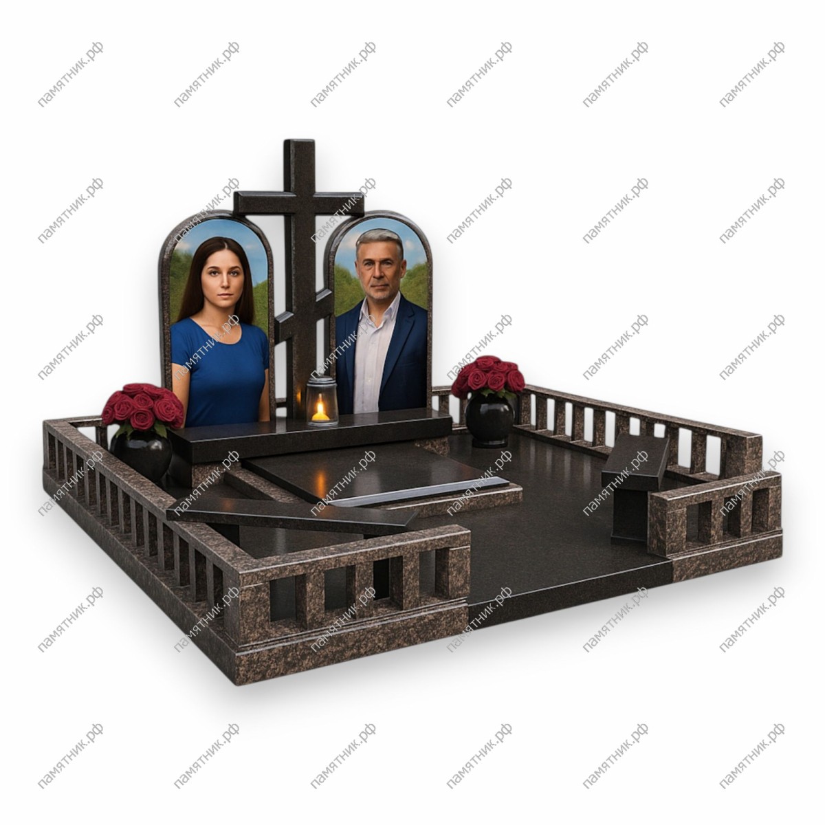 Монументальный семейный мемориал со сложной архитектурной оградой. Две классические арочные стелы с портретами разделены массивным черным крестом на постаменте. Внимание привлекает роскошный цоколь, стилизованный под балюстраду с вертикальными гранитными элементами из благородного коричневого камня.
