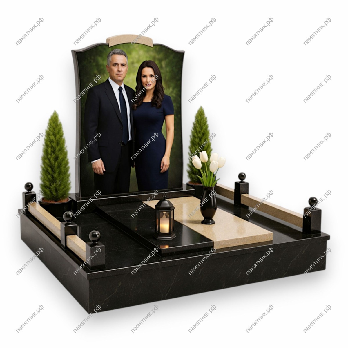 - Двухцветное оформление надгробной плиты (черный и светло-бежевый камень).