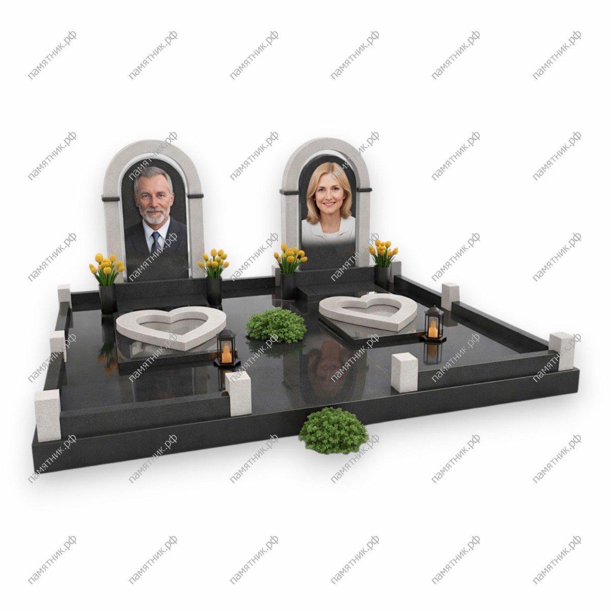 Нежный и трогательный мемориал в светлых тонах. Две арочные стелы из светло-серого гранита дополнены черными вставками для портретов. Главным украшением служат две резные гранитные рамки в форме сердец, расположенные на надгробной плите.