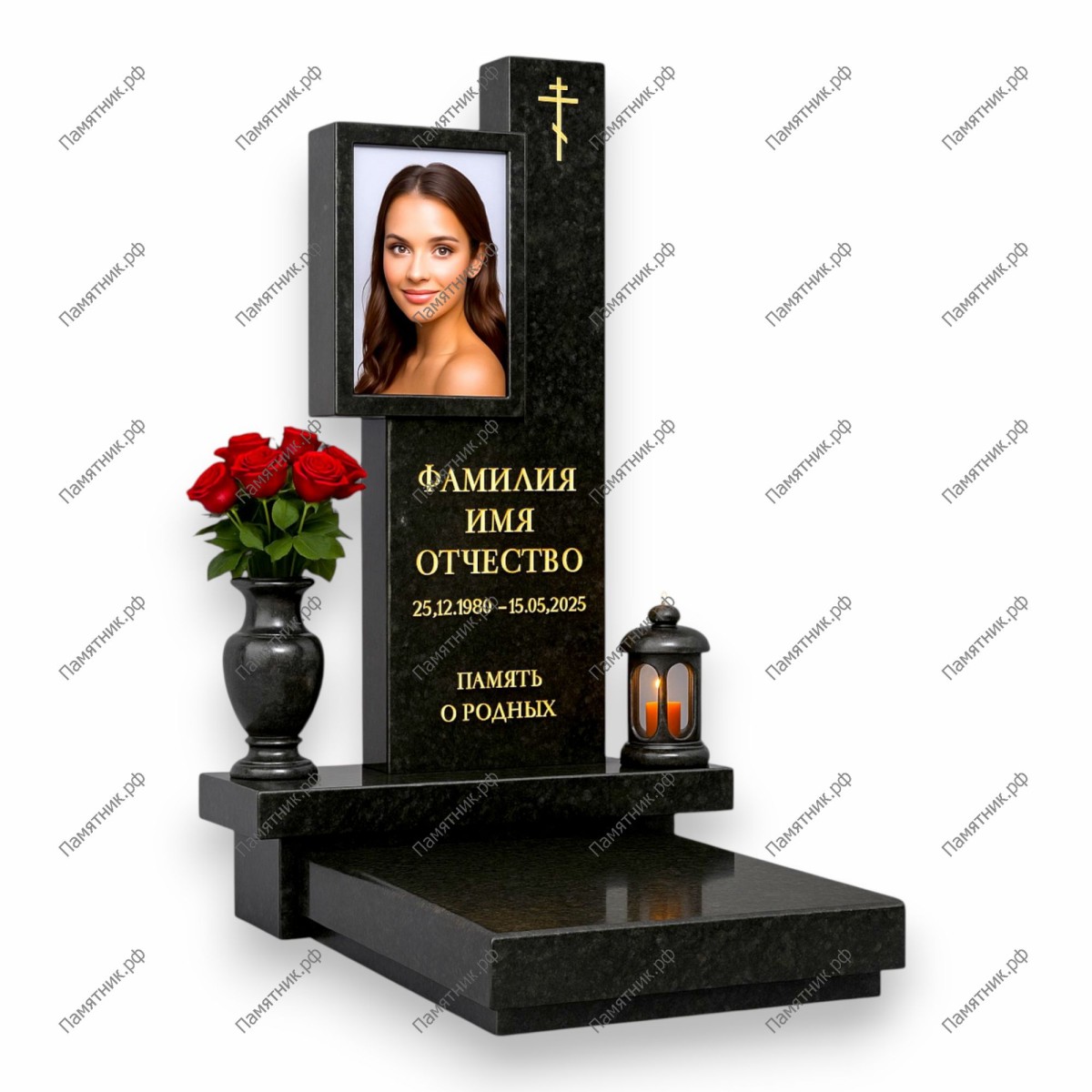 Эксклюзивный проект с объемным архитектурным решением. Фотография усопшего заключена в выступающую гранитную раму, создающую эффект глубокой ниши. Строгие формы и массивная многоярусная плита делают этот комплекс центральным элементом мемориальной композиции.