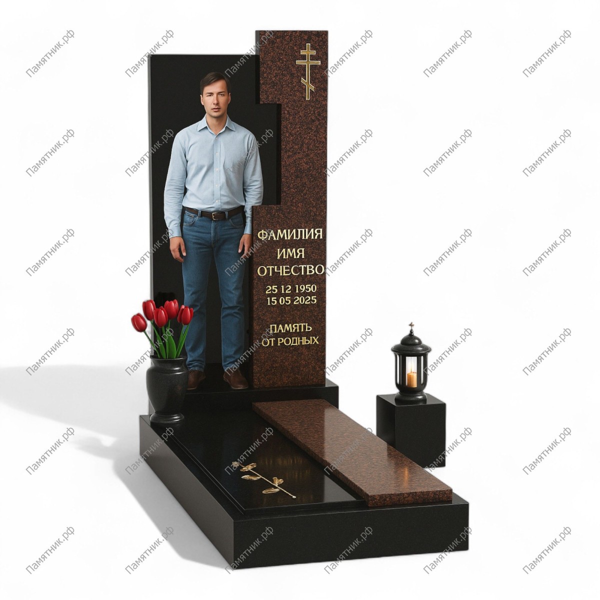 Очень выразительный, лаконичный памятник с ярким художественным акцентом. Строгая, идеально прямоугольная стела из черного габбро-диабаза служит глубоким, спокойным фоном для портрета и надписей. Главным украшением композиции является накладной элемент из красно-коричневого гранита, расположенный справа.
