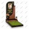 Изящный памятник с мягким радиусным скруглением. Динамику мемориалу придает врезная дугообразная вставка из коричневого гранита, которая словно «поддерживает» портретную зону. Золотая фурнитура и яркая зелень цветника создают теплую, лишенную мрачности атмосферу.