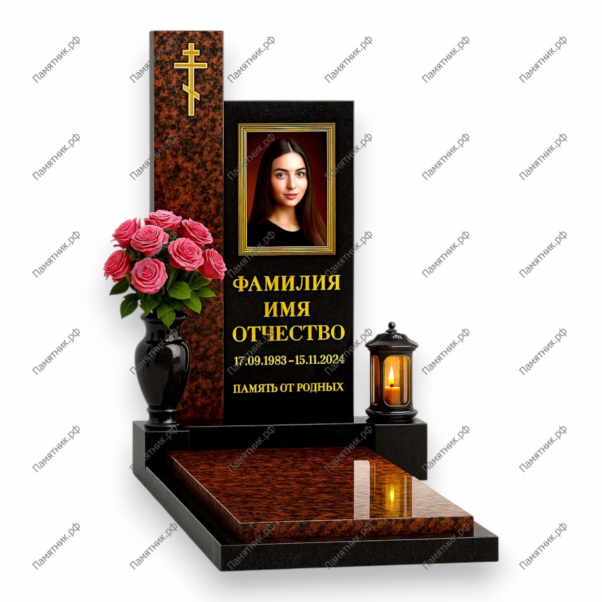 Классический двухцветный комплекс с акцентом на фактуру камня. Высокая стела из коричневого гранита служит фоном для основной плиты с портретом. Полированная надгробная плита полностью закрывает цветник, обеспечивая безупречный вид и легкость в уходе.