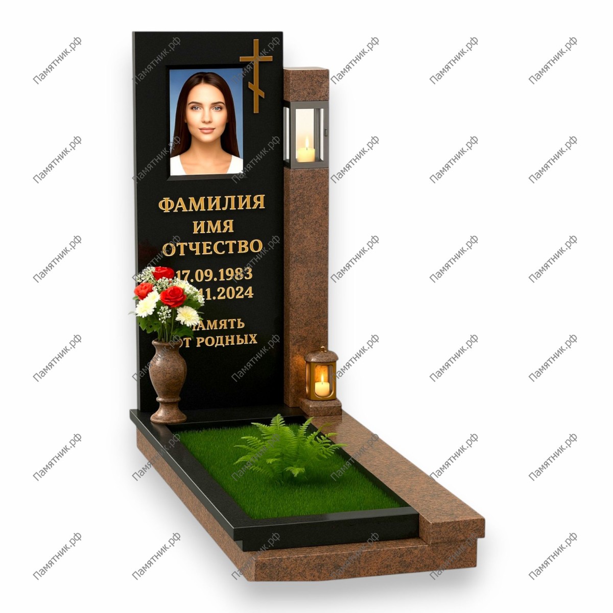 Компактный и функциональный комплекс в современном стиле. Особенностью модели является встроенный в стелу фонарь-лампада, защищенный стеклом, и высокая гранитная колонна. Темный цветник с живыми папоротниками создает эффект лесного покоя.