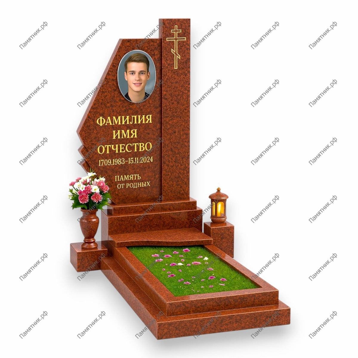 Динамичный памятник с острой геометрией. Стела имеет форму неправильного многоугольника со сложными косыми срезами. Использование ярко-красного гранита делает комплекс очень заметным и энергичным, выделяя его на фоне традиционных темных надгробий.