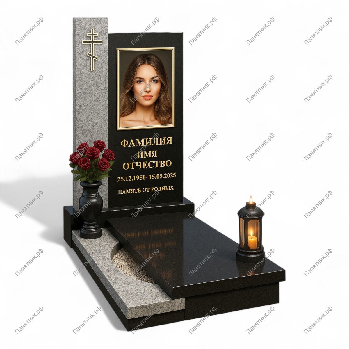 Памятник с потрясающей природной пластикой, построенный на наложении двух форм. Задняя панель из красно-коричневого гранита служит теплым, оберегающим фоном. На нее наложена черная стела с изящным волнообразным краем. Это многослойное решение создает 3D-эффект и символизирует незримые объятия ангела-хранителя.