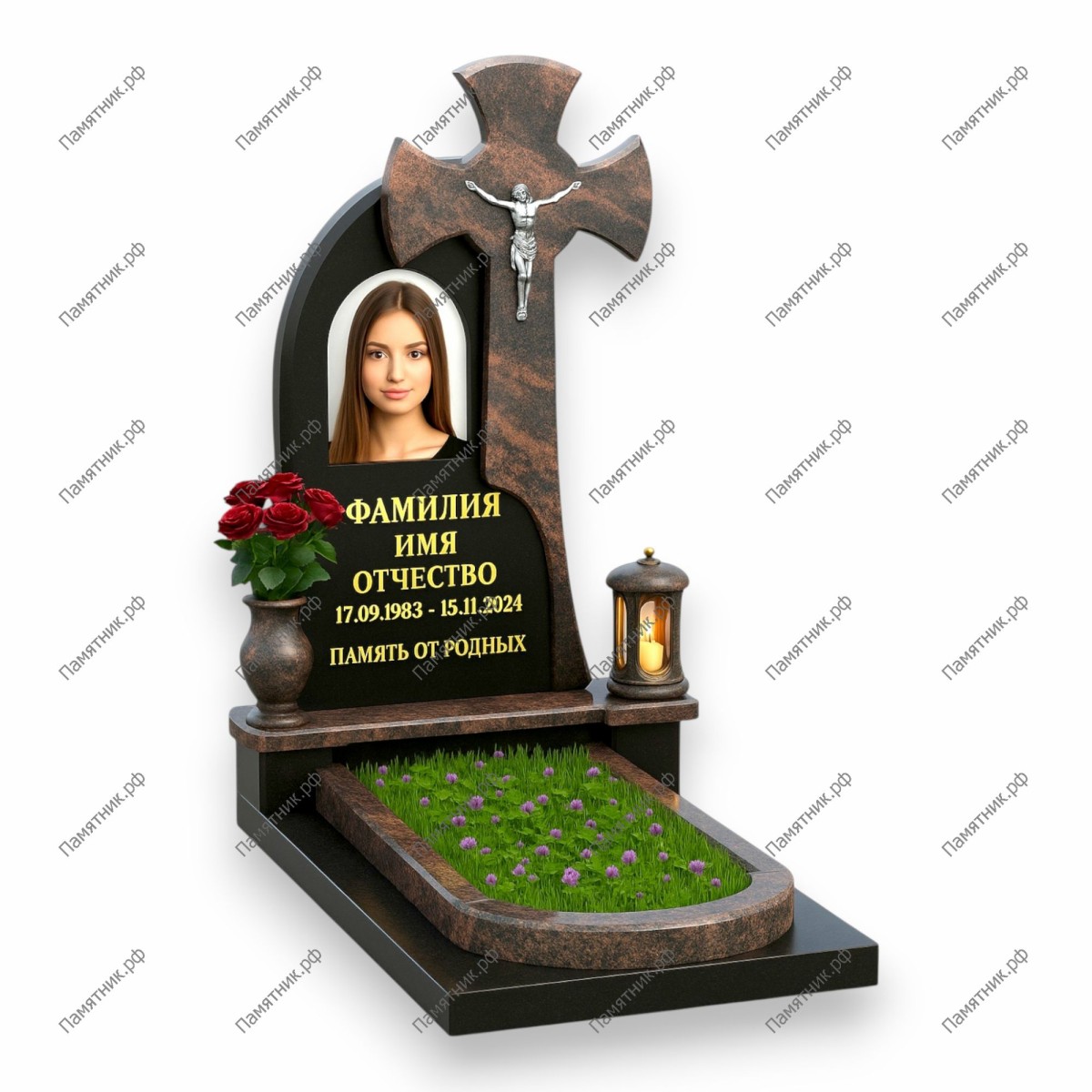 Художественный комплекс со сложной фигурной вырубкой. В основную черную плиту интегрирован массивный крест из текстурного коричневого гранита с накладным распятием. Мягкие обводы стелы и округлый цветник создают законченный и гармоничный образ.