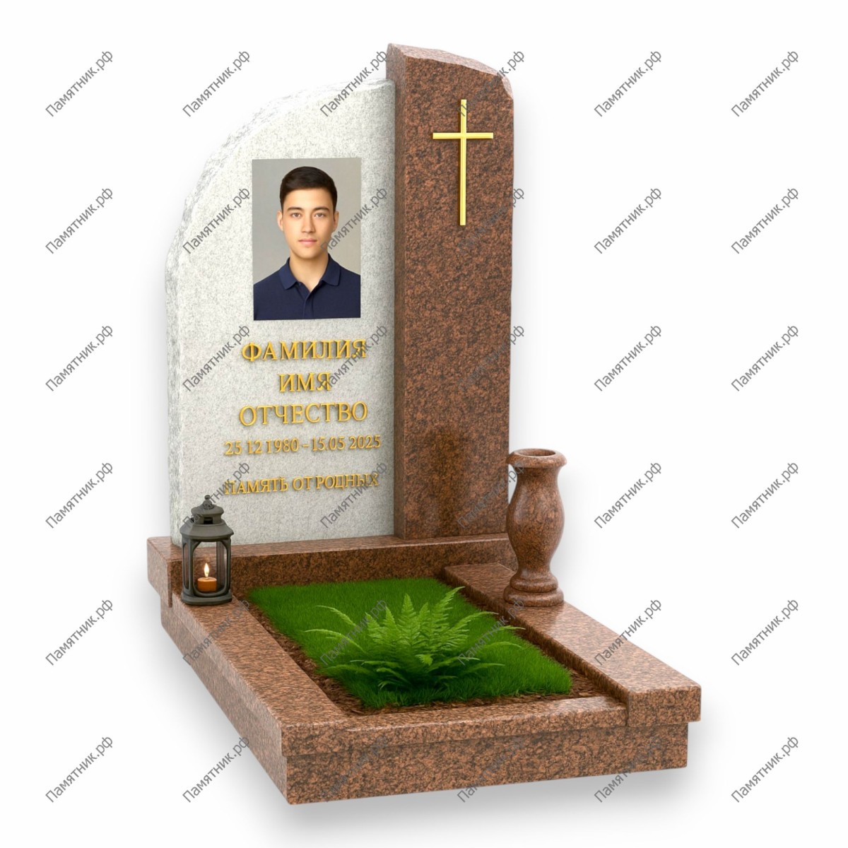 Светлый и теплый мемориал, выполненный преимущественно в коричневых и серых тонах. Стела имеет мягкий скос и необработанный «скальный» край слева, что подчеркивает природную красоту камня. Идеально подходит для создания спокойного, умиротворенного места памяти.