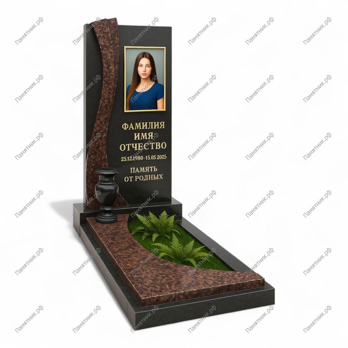 Геометрическая тема поддерживается и в основании: светлый прямоугольный цветник покоится на массивном черном цоколе. Это стильный, выразительный мемориал без лишней помпезности.