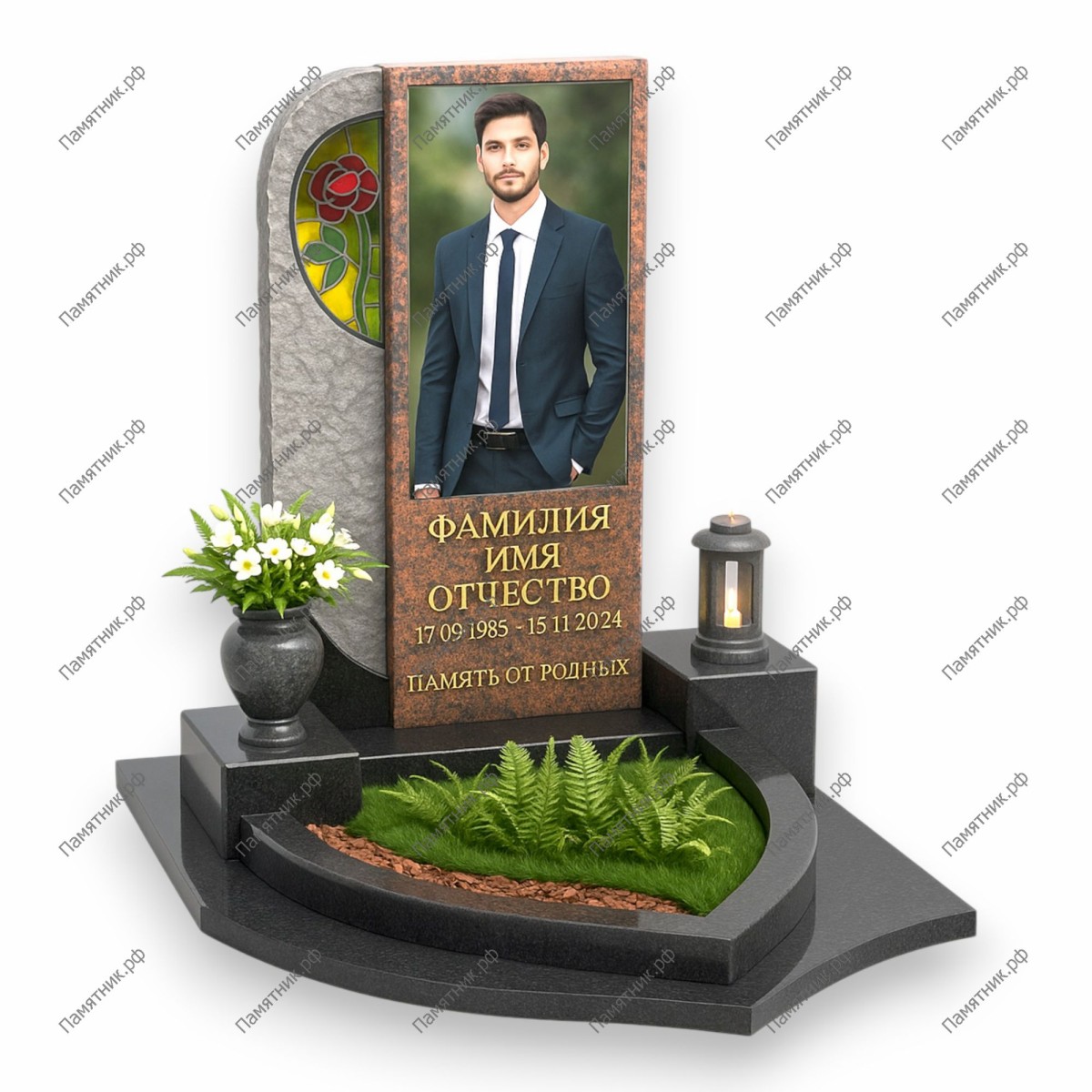 Потрясающий по красоте комплекс, объединяющий камень и стекло. В левой части серой фактурной стелы расположено декоративное окно с цветным витражным изображением розы. Центральная плита из коричневого гранита несет на себе ростовой портрет, создавая эффект присутствия в тихом саду.