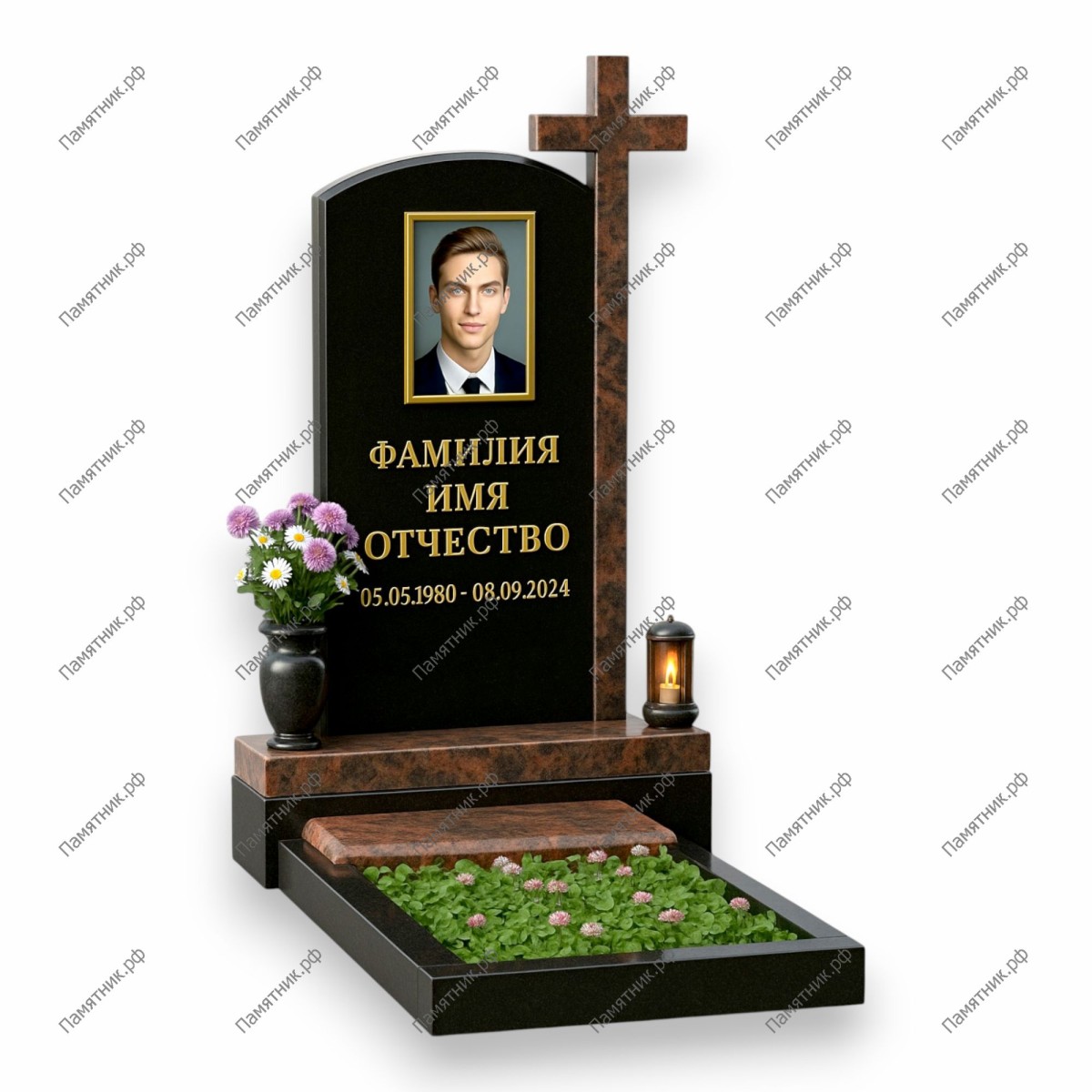 Лаконичный мужской мемориал с выраженным вертикальным акцентом. Черная стела с мягким скруглением верха дополнена высоким врезным крестом из коричневого гранита. Плавный радиус надгробной плиты повторяет форму стелы, создавая гармоничный и устойчивый образ.