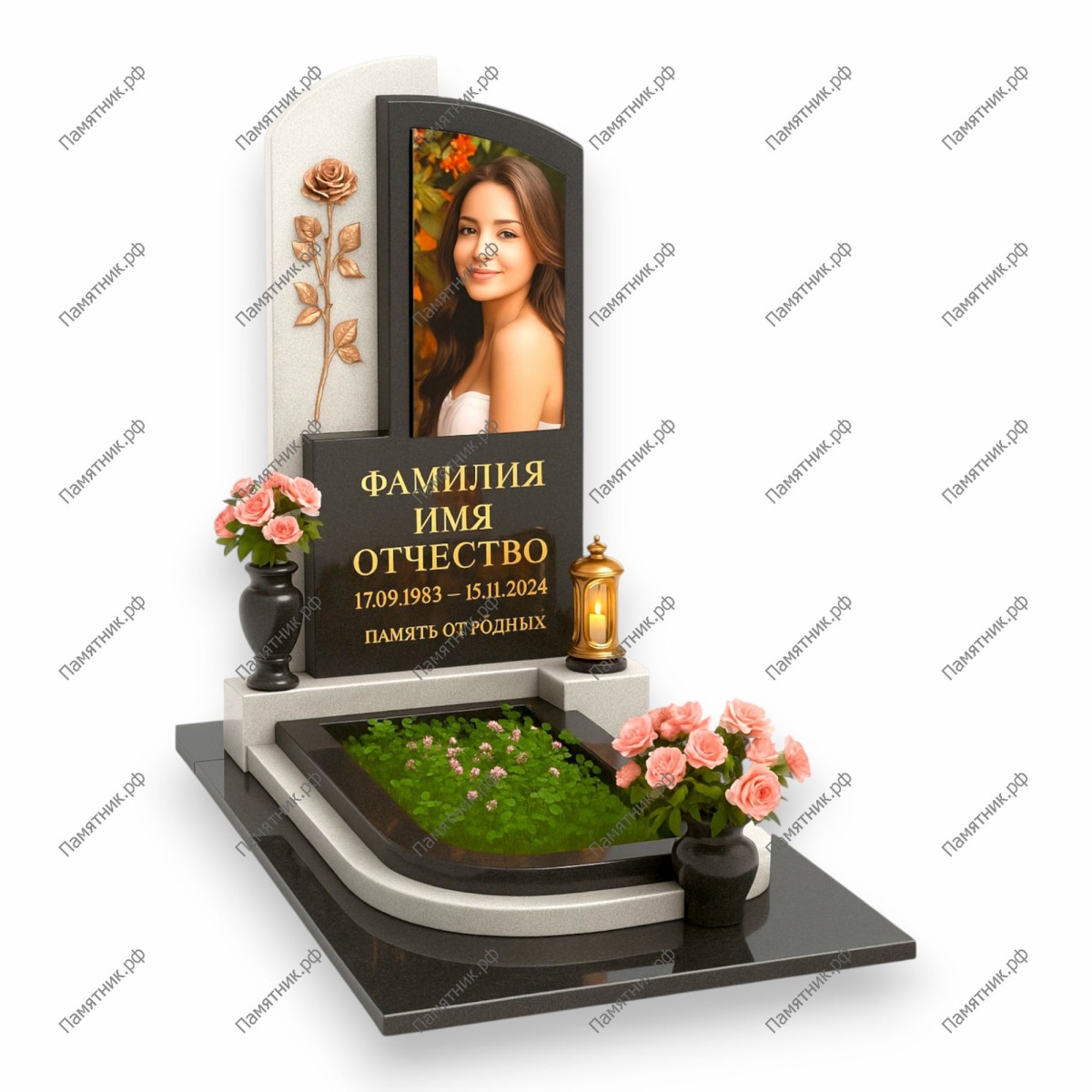 Лиричный женский комплекс, главным украшением которого является объемный барельеф розы из бронзы или резного камня. Черная стела сложной формы с арочным верхом установлена на светлое основание, которое плавно перетекает в изящно изогнутый цветник.